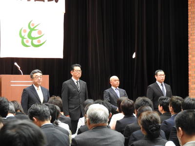 4月3日(水)、喜多方市教職員対面式を行いました。喜多方第一中学校の武田校長先生が着任した先生方を代表してあいさつを述べられました。今回の人事異動により、111名の新しい先生方をお迎えすることができました。喜多方の児童生徒のために、よろしくお願いいたします。