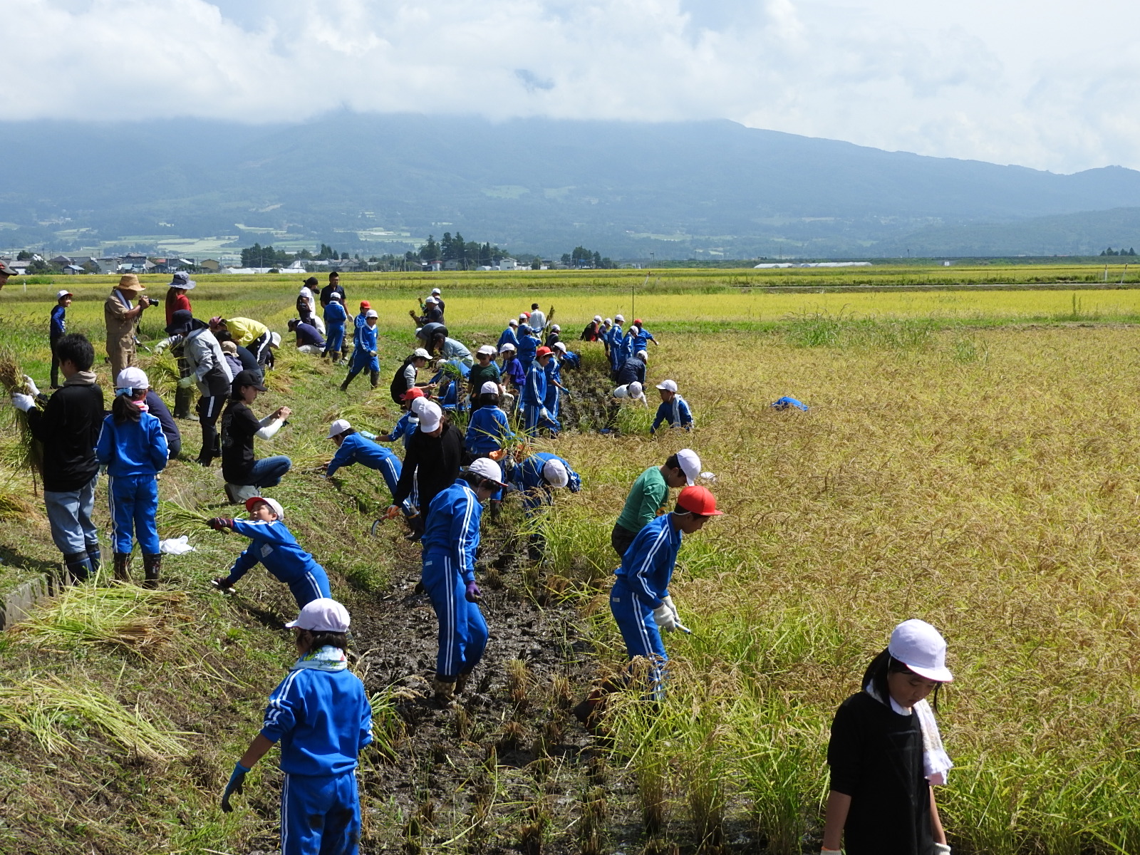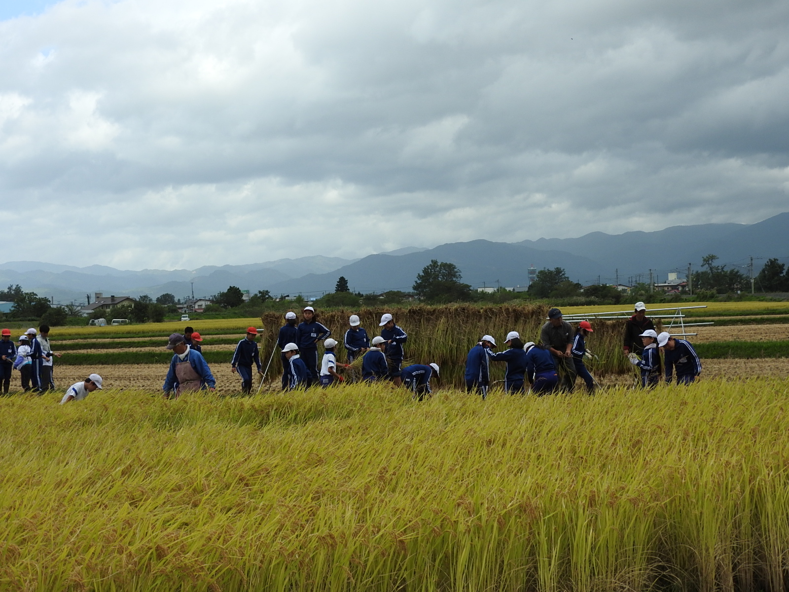 9月14日(金)は堂島小学校で先頭をきって稲刈りが行われました。田んぼがぬかるんでいて足元をとられながらの大変な作業でしたが、高学年生が低学年生をやさしくサポートするなど、全校生で協力しながらしっかりと稲を刈り取ることが出来ました。