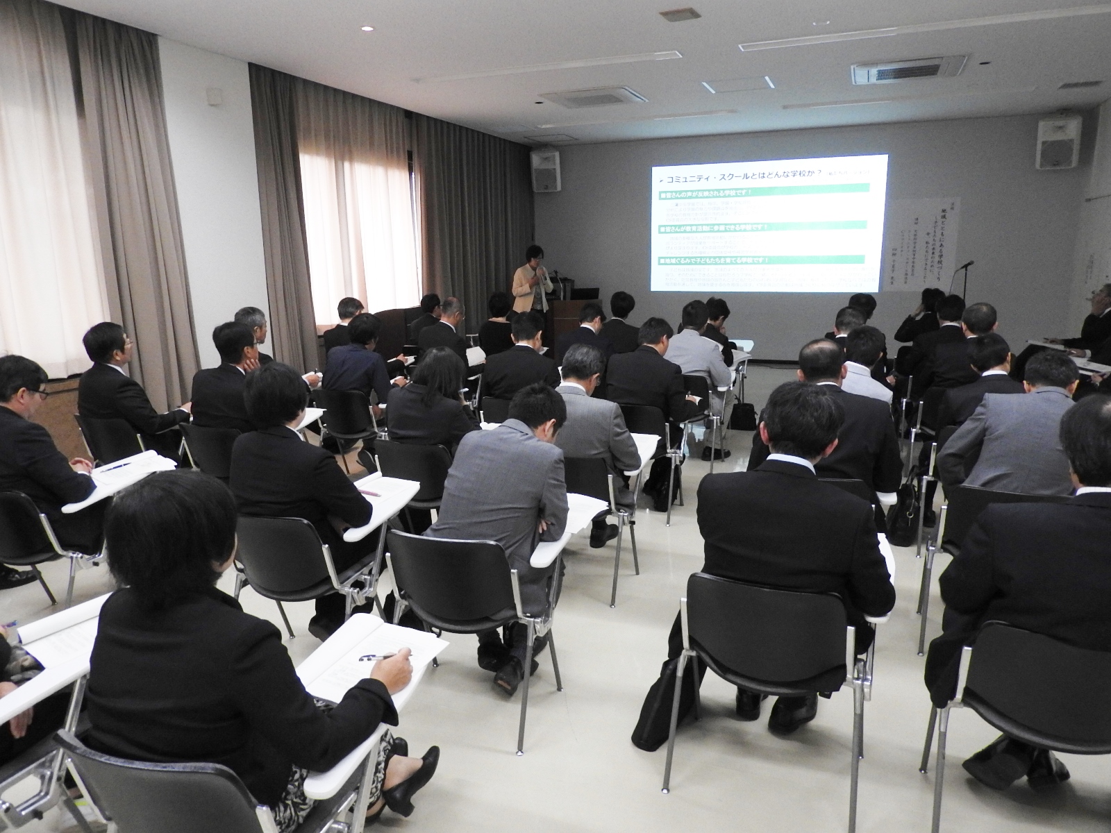 四柳先生からは、「地域とともにある学校づくり~子どもたちの未来のために、今、私たちにできること~」と題し、東京都三鷹市の先進的な取組を紹介していただきました。参加された校長先生や教頭先生、PTA会長さんなど約40名の参加者は、熱心にメモをとって聴いていました。