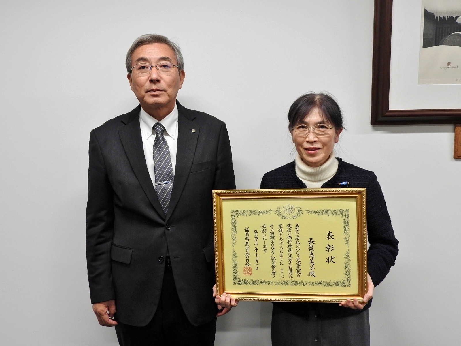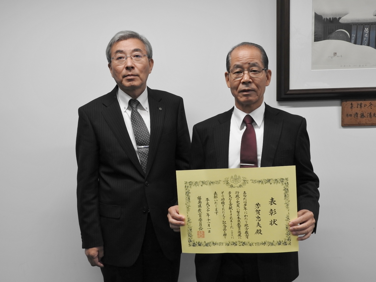 本市関係では、芳賀忠夫前教育長が、教育長として教育行政施策を推進し、教育行政の充実に関して顕著な功績があったとして「地方教育行政功労者」に、塩川小学校の長嶺恵美子栄養教諭が、学校給食の振興に尽くし功績が顕著であるとして「学校体育・学校保健功労者」として表彰されました。