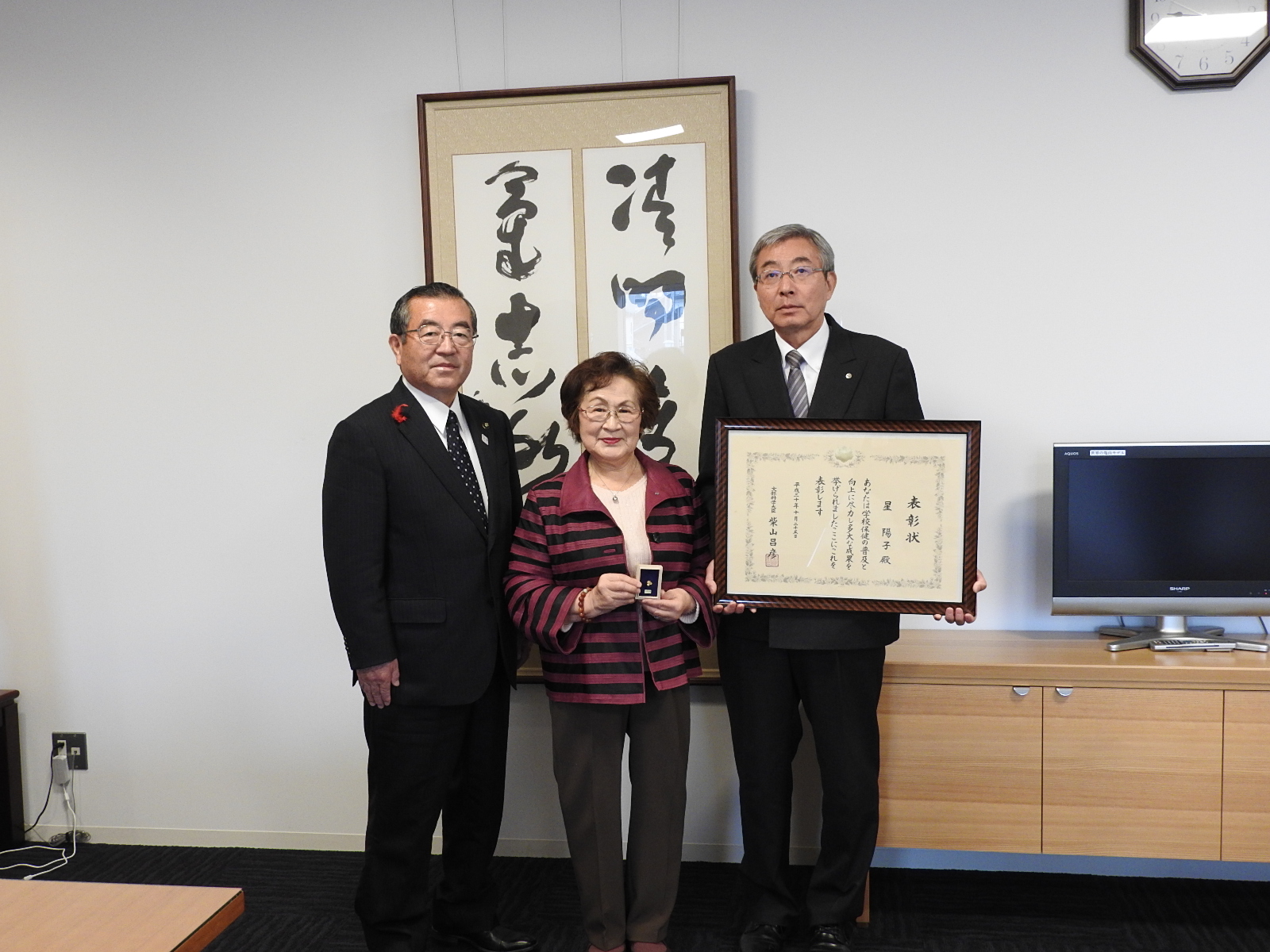 星さんは、昭和52年から第一小学校薬剤師として41年間、また昭和62年から第二中学校薬剤師として31年間、子どもたちの健康・衛生にご尽力いただいております。そのほか、様々な公職において活躍され、多くの表彰もされています。昨年度は各種功労者知事表彰(薬事衛生功労)、今年度は日本薬剤師有功賞を受賞されました。ご本人は、「長いことやってきたので…」と、ご謙遜のお言葉でしたが、たいへん名誉なことです。表彰おめでとうございます。これからもよろしくお願いいたします。