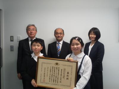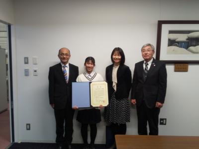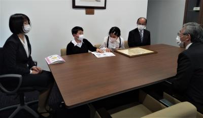 4月26日(金)、第一小学校 保健委員会委員長 酒井さん、副委員長 齋藤さん及び杉原校長先生、養護教諭 長谷川めぐみ先生が「令和2年度優れた早寝早起き朝ごはん運動の推進にかかる文部科学大臣表彰受賞報告」のため、教育長室を訪問されました。
