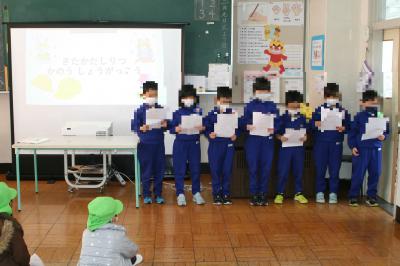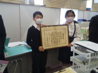 保健委員会では、低学年の児童に正しい歯磨きのしかたを教えたり、各学級のテレビをつかって正しい手の洗い方を放送するなど、日頃から虫歯予防やからだの健康づくりに取組んできたことが評価され全国表彰となりました。