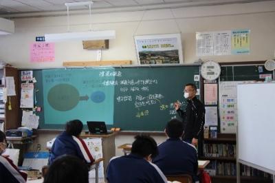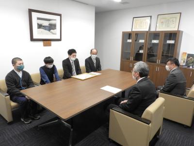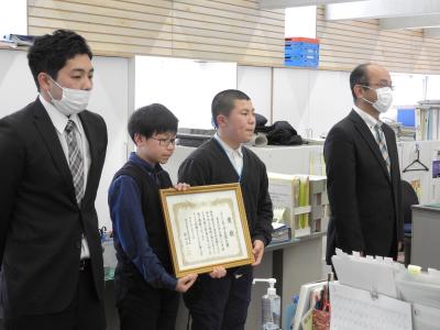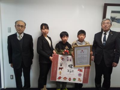 3月11日(木)、堂島小学校 佐川校長先生、6年担任伊藤先生、児童代表の6年 福地さんと佐藤さんが「ふくしまジュニアチャレンジ」金賞受賞の報告で教育長室を訪問されました。「ふくしまジュニアチャレンジ」は新型コロナウイルスなど想定外の事態とどう向き合い、地域を元気にするかをテーマに募集されたものです。堂島小学校では、コロナ禍の中、地域との絆を深めるためにできることを児童自らが考え、ふるさと堂島じまん健康弁当作成プロジェクト」を立ち上げました。5、6年生が弁当の献立やオリジナルのパッケージづくりを行ってきたことや、活動を通して地元企業をはじめ地域の方々とのつながりが深まったことが認められ今回の受賞となりました。