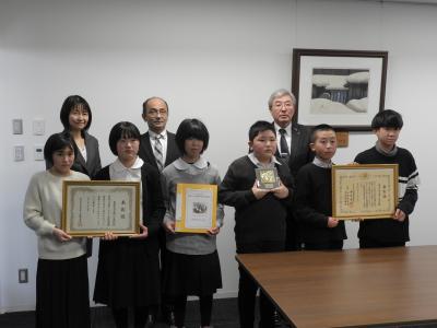 3月11日(木)に、第一小学校の杉原校長先生、長谷川先生と、保健委員の大金さん、五ノ井さん、大堀さん、長井さん、角田さん、小菅さんの8名が、全国健康づくり推進学校優良校の受賞報告に教育委員会を訪問しました。