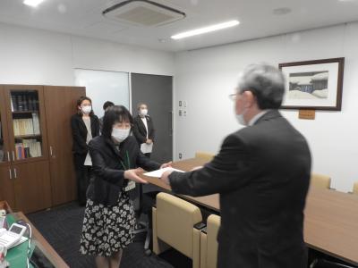 先生方からの受賞報告の後、教育長より「この度は、おめでとうございます。これからも教員の範として、ますますの活躍を期待します。」とお祝いと激励の言葉がありました。