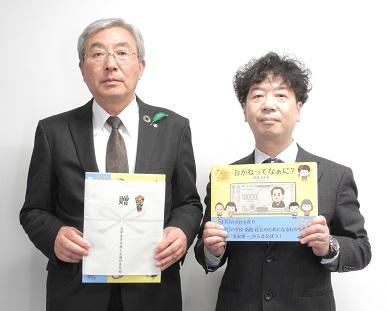 4月27日、会津喜多方商工会議所青年部会長 密井 康一 様より、絵本(渋沢栄一が教えるお金の話「おかねってなぁに?」35冊)を寄贈いただきました。