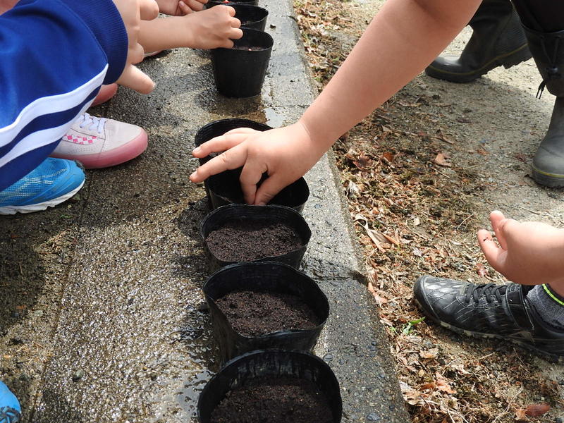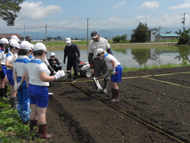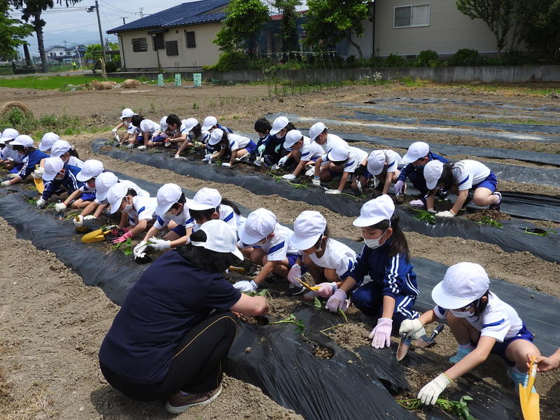 5月26日、晴天の中、豊川小学校ではサツマイモやじゃがいも、ポップコーンの種まきが行われました。