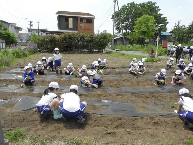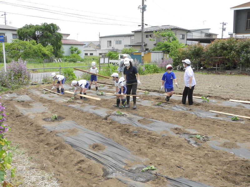 マルチに穴をあける、苗を植える、水やりなどグループに分かれて活動していました。