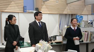 続いて、今月末をもって退職される第一小の佐川校長先生、第二中の田代校長先生が、ご挨拶に教育委員会においでになりました。教育長からは、各学校で子どもたちの「生きる力」を育むためにご尽力いただいたことへの感謝の言葉がありました。