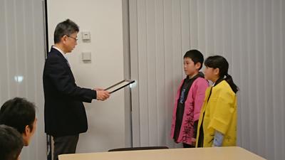 第一小学校が、令和元年度温暖化防止にみんなで取り組む「福島議定書」事業(学校版)において最優秀賞を受賞し、2月21日(金)に、校長先生、児童代表1名、担当の先生が教育長への受賞報告のために市役所においでになりました。
