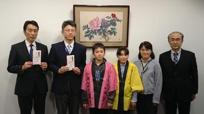 2月28日(金)、あいづ塩川湯川ライオンズクラブ加藤様、田澤様、小島様が堂島小学校、塩川小学校、姥堂小学校、駒形小学校の新入学生用のランドセルカバーの贈呈のために、市役所においでになりました。学校教育課の武藤主幹兼管理主事がランドセルカバーを受け取りました。