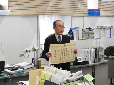 喜多方一小の佐川校長先生が、長年にわたる教育分野での功績が認められ、今年度の教育者表彰を受賞されました。1月30日(木)、教育長への受賞報告のために教育委員会においでになりました。佐川校長先生は、1月28日(火)に東京都の日本消防会館での授賞式に臨まれ、文部科学副大臣より表彰状を授与されました。その後、皇居で行われた拝謁式では、天皇、皇后両陛下よりお言葉をいただいたとのことでした。
