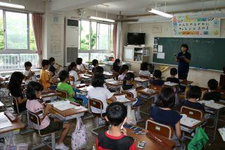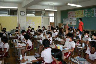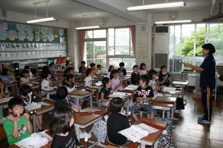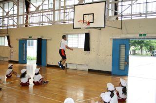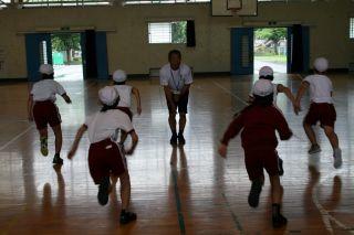 2020年7月6日 15時00分7月16日(月)。体育アドバイザーの武藏先生に14日(金)に引き続きおいでいただきました。本日はあいにくの雨でしたので3年生は体育館で幅跳びの学習でした。遠くまで飛ぶには腕を上手に使うことを教えていただき,早速チャレンジ!腕を意識すると,遠くまで飛べることを実感したようです。ぜひ自己記録を伸ばしてくださいね!