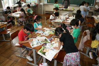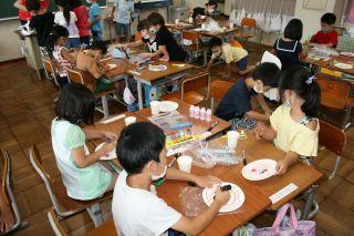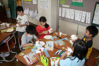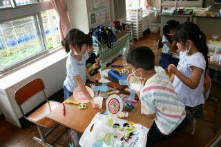 2020年7月7日 12時56分7月7日(火)。1年生が生活科で「みずであそぼう」の学習をしていました。水を使って遊ぶ道具をみんなで作っています。シャボン玉を作るストロー,紙皿を使った景品用のメダルや的,ペットボトルの水鉄砲など身近にある物を利用して作っていました。グループでマジックやセロハンテープなど譲り合いながら,なかよく楽しく作ることができました!