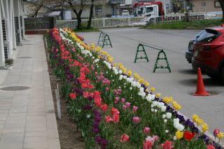 午前中は非常に天気が良く,磐梯山もくっきりと見えました。花壇のチューリップも日光をたくさん浴びて,輝いています。