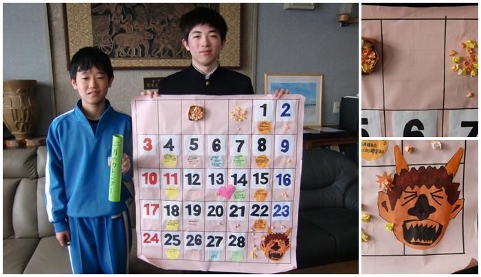 恒例のあおぞら学級カレンダー!2019年も早や2月「如月(きらさぎ)」となりました。4日には立春を迎え、厳冬のなかにそこはかとなく感じる、春の兆しをひそやかに愉しみたい季節です。小雪が舞ったり、小雨になったりと天候がまだまだ不順です。節分(2月3日)で各ご家庭では「豆まき」をされたことでしょう。「ワタナベさん、サカタさんは豆まきが必要ない説」信じますか? 「鬼の面」を工夫しました。