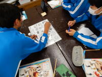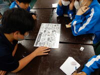 2年生の家庭科では既製品の表示について学びました。取り扱い表示をカルタにして、表示に慣れる活動をしました。その後、グループの中でルールを決め、消費者庁の「洗濯表示すごろく」を使い、楽しみながら表示の理解を深めました。