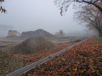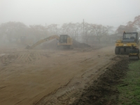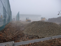 2017年11月7日 10時11分 朝靄(あさもや)の中、グラウンドの整地作業が開始されます。ロードローラー、ドーザーショベルなどの重機車が揃いました。表面(土壌)を削って、砂や砂利を敷き詰めているようです。生徒たちは待ち遠しいことでしょう! 旧体育館の跡は、完全に更地になりました。次の工程が楽しみです。(312)