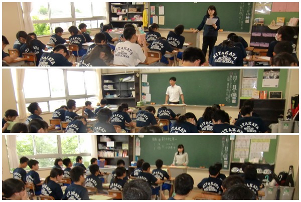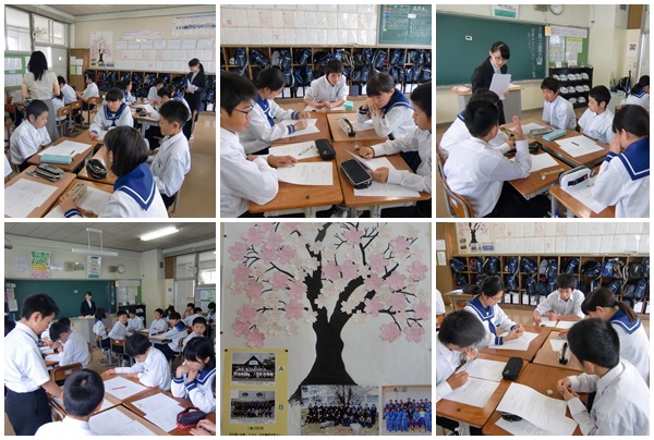 教育実習生の武田美津姫さんによる1年1組道徳の授業を参観しました。主題名『希望と勇気、克己と強い意志』資料として、「Dream of Life」の歌詞とCDを効果的に活用しました。「皆さんは将来の夢がありますか?」生徒の反応に吃驚、生徒の多くが将来の職業(夢)を意識して、そのために努力すべきことをワークシートに記入しました。歌詞カードから、自分が好きな歌詞を選び、その理由を発表させ、MVPの樹へ気に入った言葉・フレーズを真剣に色紙に書いていました。机間巡視をしながら生徒に声かけするなど、落ち着いた態度で授業は展開しました。お疲れ様でした。