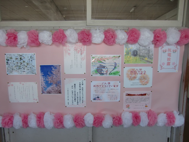 平成30年度 喜多方市立第一中学校の入学式は、明日挙行します。89名の新入生を歓迎いたします。これから一中での3年間の学習や生活は、君たち自身の努力に委ねられる部分も多くありますが、その努力が報われ、自己実現を目指すための指導者・サポーターが私たちです。小学校時代お世話になった先生たちからのメッセージ(祝 入学!)も掲示しました。明日は元気に胸を張って校門をくぐってください。(513)