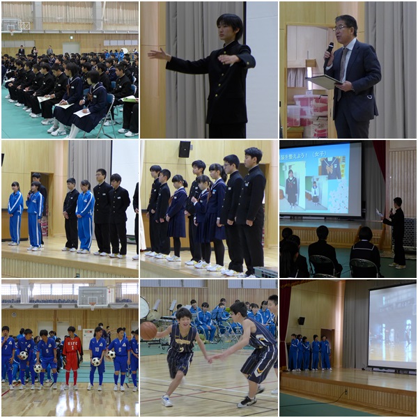 校長先生の式辞は「真・善・美」、「ルールとマナーを意識して」、「一中プライドをもって」、「授業の約束 シン・ゼン・ビ」など一中生が常に心がけ、大事にしている言葉をもとに、学習、部活動をがんばろうというお話でした。