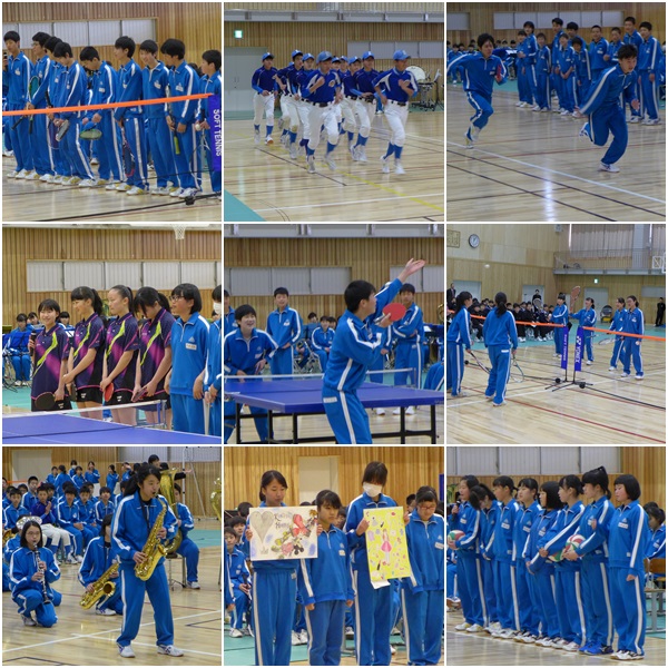 生徒会本部から中学校の1日、清掃のやり方などについて画像、動画を交えて丁寧に説明がありました。とてもわかりやすくまとめてあり、生徒会本部の準備の素晴らしさや、不安な新入生の気持ちを考えた親切・丁寧な説明に感心しました。各委員会の委員長さんからは委員会の目的、活動内容の説明がありました。堂々とした発表態度で、一中は専門委員会も活発に活動している様子が良くわかりました。また、部活動紹介は各部とも熱の入った実技、説明で新入生もどの部に入部するか迷っていました。(521)