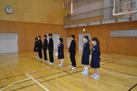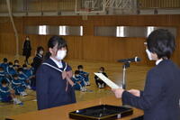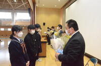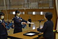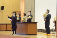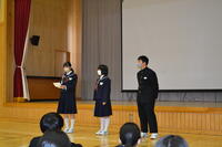 離任される先生方から生徒たちに向けたメッセージをいただき、生徒会よりお別れの言葉と花束を、そして卒業生も含めた全校生より最後の校歌合唱を贈りました。