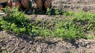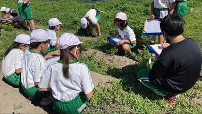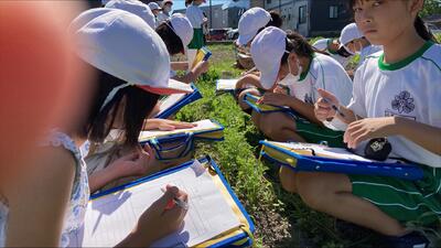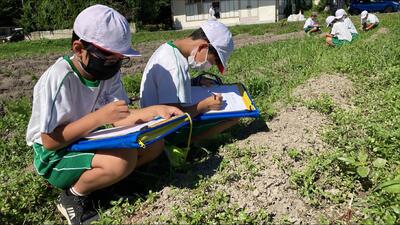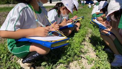 4年生が農業科で育てている人参が順調に育っています。今日は,朝のうちに観察をして記録カードをかきました。