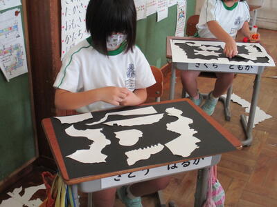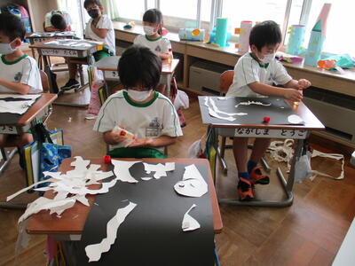 はさみを自由に動かして,偶然できた形から発想を広げて,黒の台紙に画面構成を考えて並べていきます。