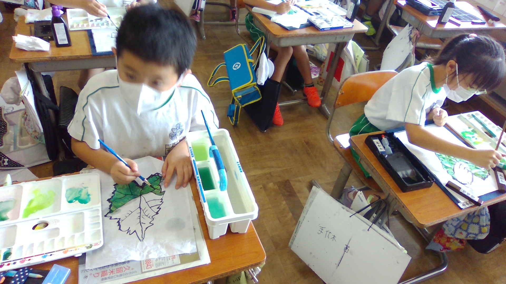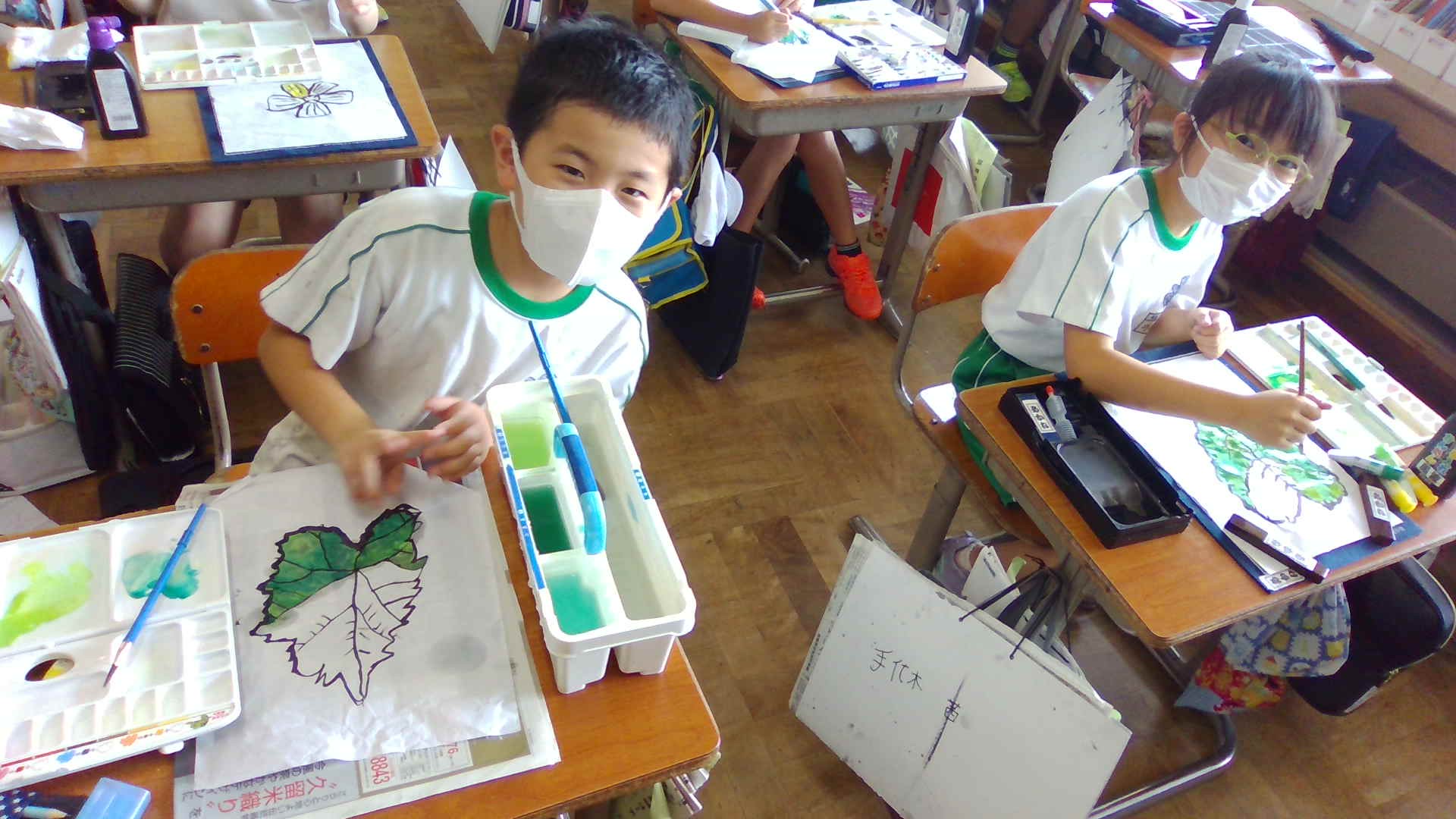 2022年9月2日 11時38分4年2組の図工の時間,今日は,育てているヘチマの写真をよ~くよ~く観察しながら、絵具だけでなく、習字絵具も使って、ヘチマの絵を描いています。色の塗り方も工夫しています。