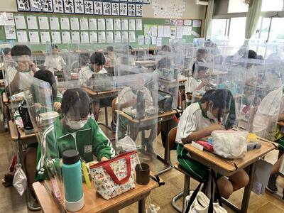 2022年9月2日 12時43分各学年,おいしいお弁当の日も,しっかりとシールドを置いて黙食です。
