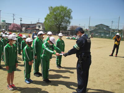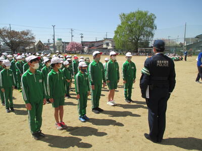 交通教室 (6年) 2023年4月10日 17時21分 6年生は、この交通教室で「家庭の交通安全推進委員」に任命されました。喜多方警察署から任命された6年生は、代表児童が推進委員として守っていくことを宣誓してから交通教室に真剣に臨みました。