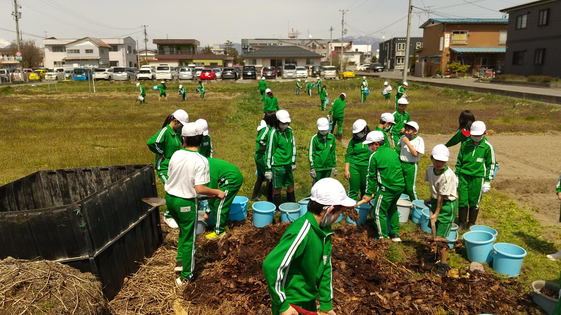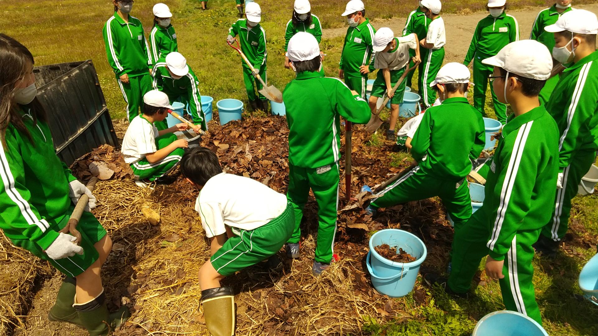 昨年までは、できあがった畑での作物栽培でしたが、今年は土作りから始めました。昨年から作ってきた堆肥を二小の圃場全体に撒く活動をしたのですが、ミミズが出てきたり、虫が出てきたりしてもがんばって堆肥撒きをしました。