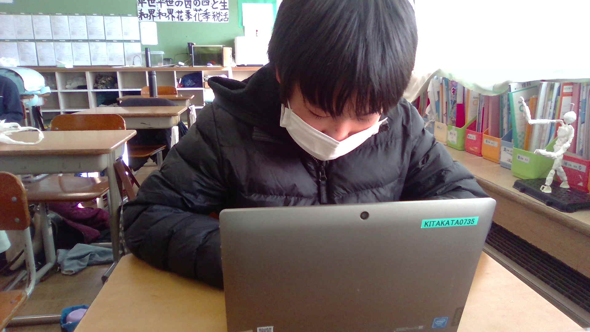 6年生は、昨日、タブレット上で算数のプリントを全員に配布し、宿題で、その問題を見ながらノートに写して解答し、今朝配布された解答用紙を見ながら、学校で答え合わせをして、担任の回収箱に提出するということを実施しました。手順が分からない児童は友達に聞きながら、ほとんどの6年生がミッションコンプリートできました。