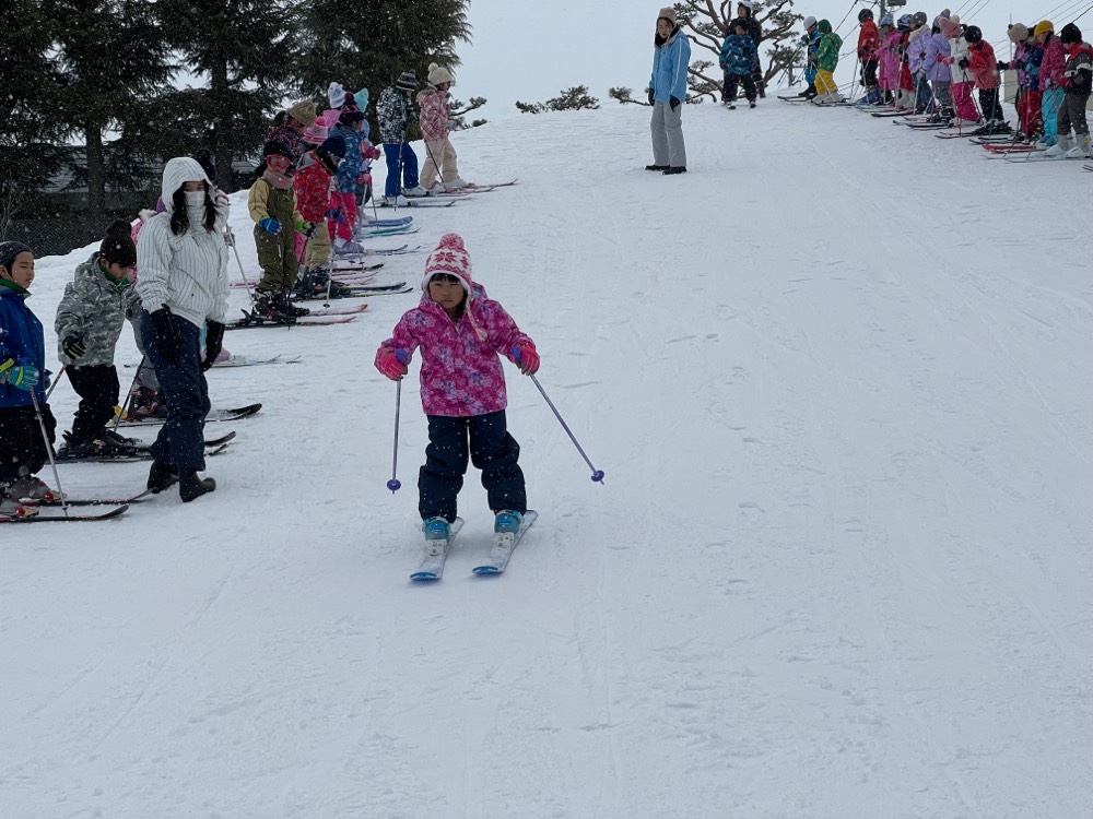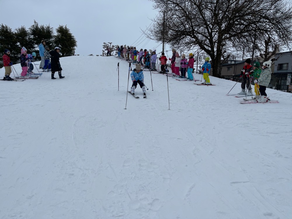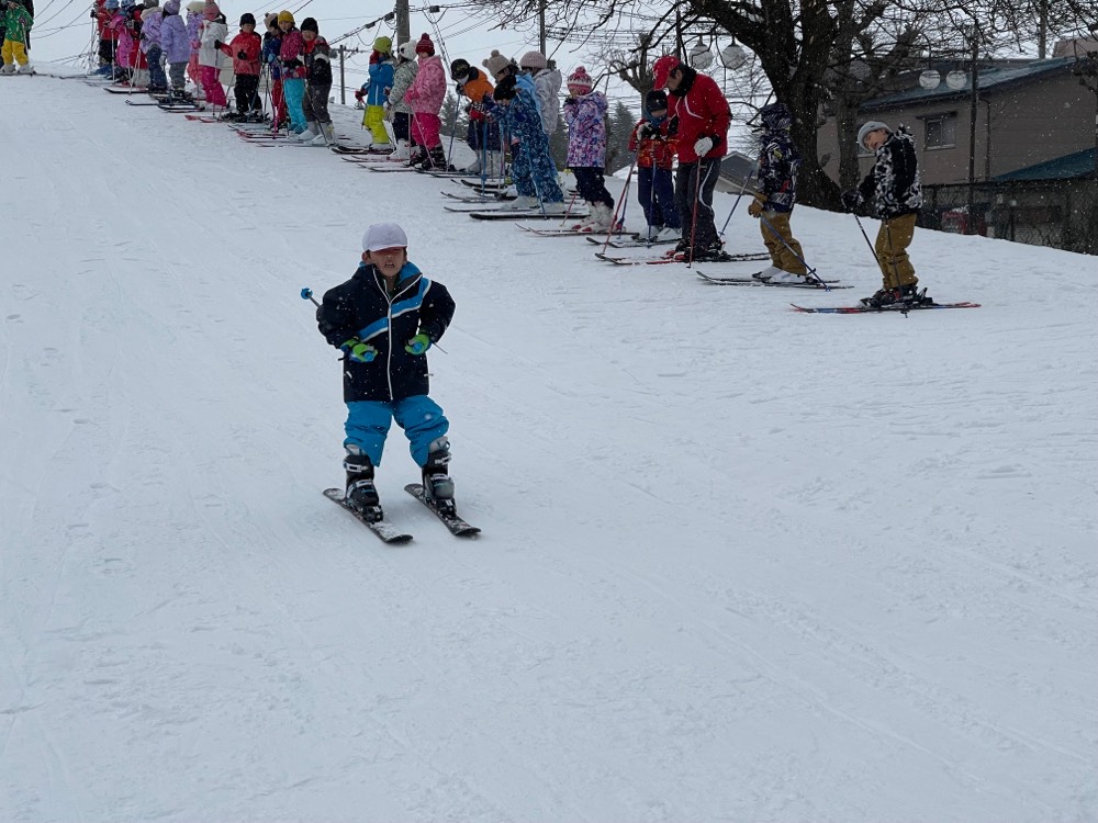 今日は,1年生の校内スキー教室が行われました。2時間たっぷりとスキーの学習をし,ほぼ全員がほおの木山の頂上から滑ることができました。