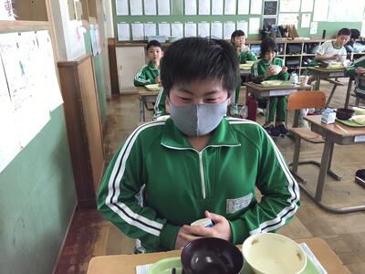 今日の給食の「揚げかぼちゃの甘辛だれ」は,4年1組の五十嵐さん,本田さん,菊地さんが考えたメニューでした。