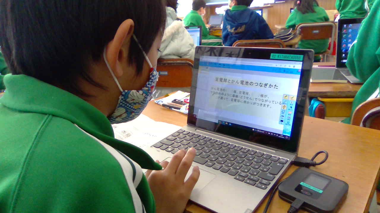 理科の「明かりをつけよう」の学習が終わりました。今日は学習の振り返りです。教師がタブレットで問題を作成して全員のタブレットに送り、子どもたちはその問題に答えてファイルを提出する、というやり方を試してみました。電子連絡帳や電子健康観察など、少しずつスキルアップですね。