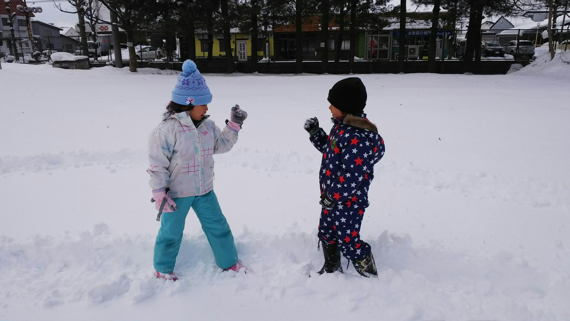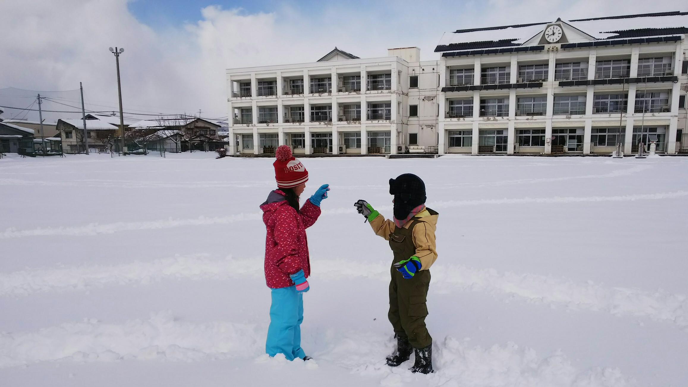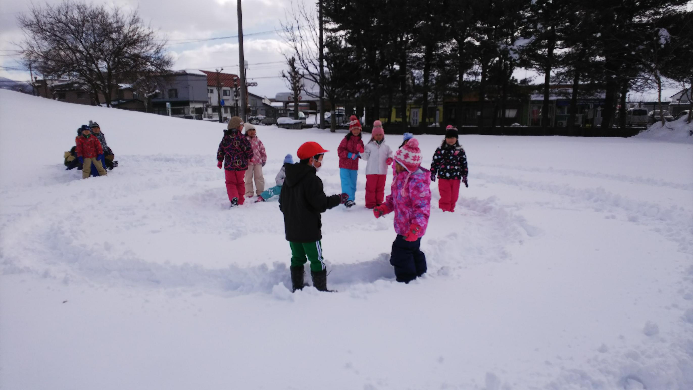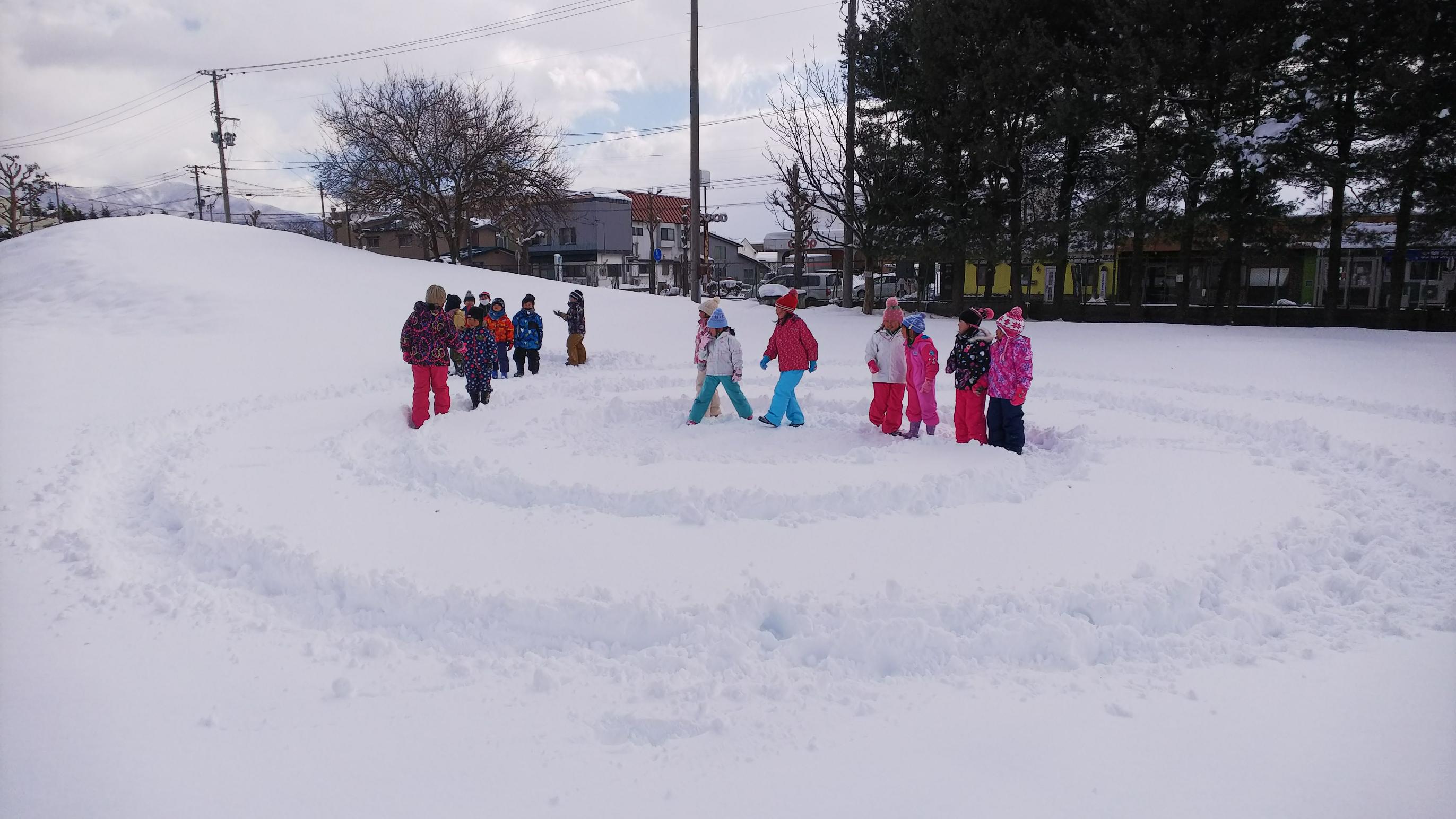 1年3組は,生活科の時間に雪遊びをしました。校庭にたっぷり積もった雪の上に渦巻きを作り,雪上ぐるぐるじゃんけんをしました。男子チームと女子チームで対決し,結果は1対1で引き分けでした。とっても楽しかったです!