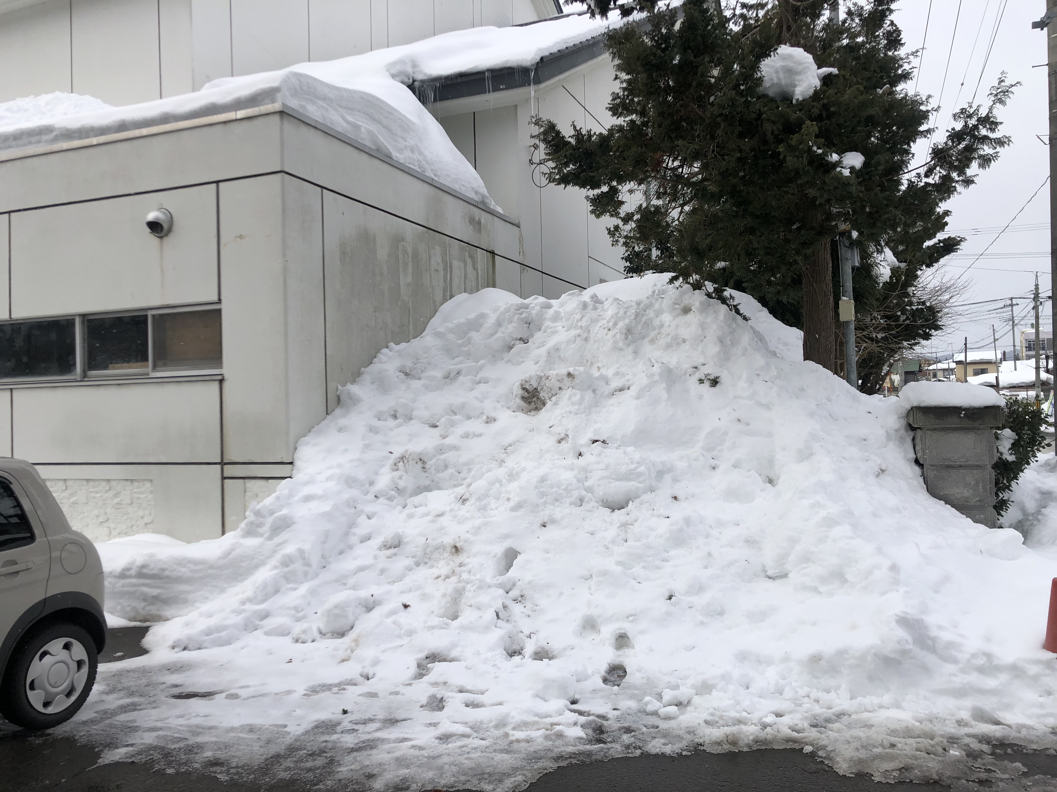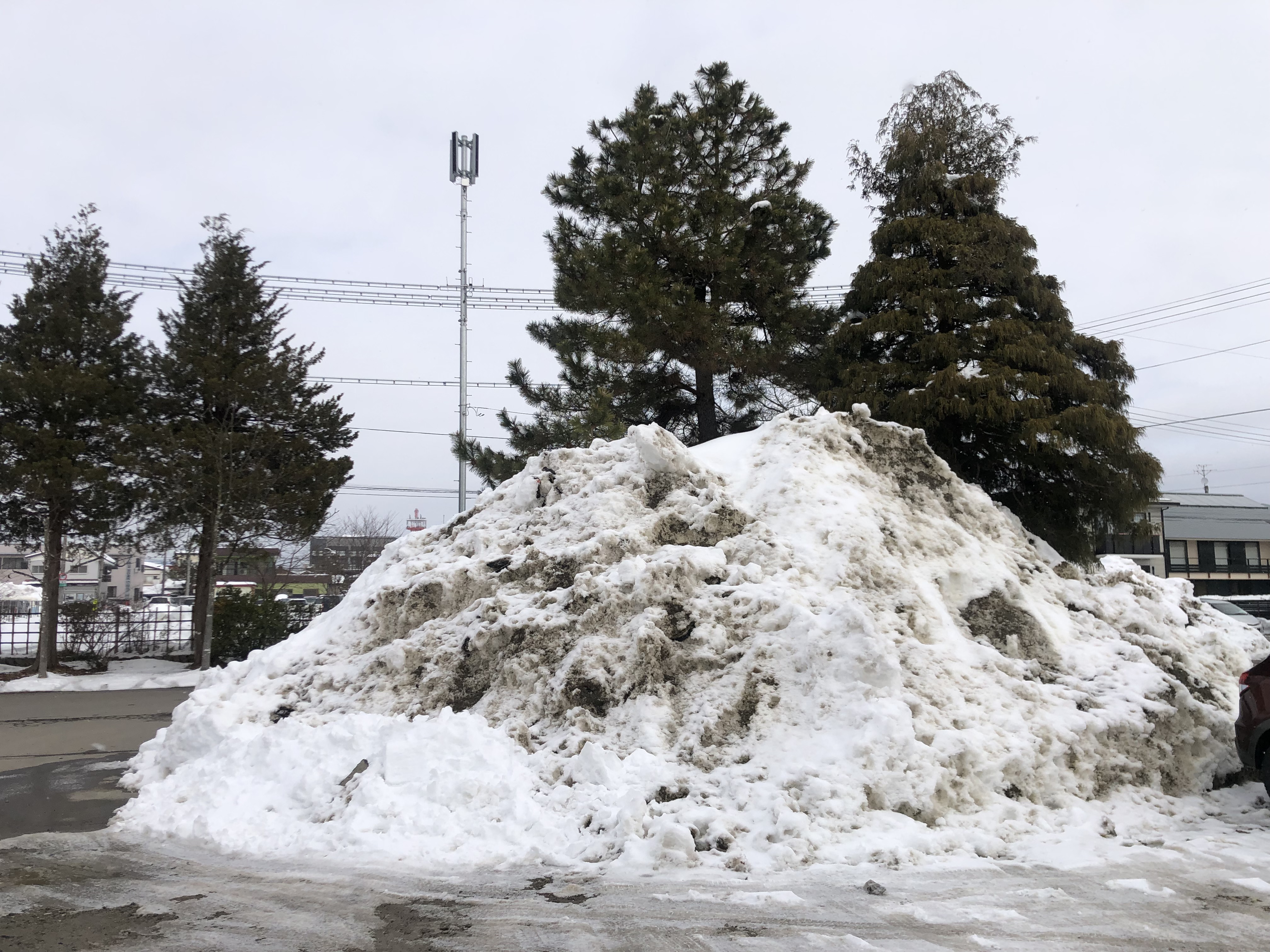 学校の駐車場には,今までの除雪で積み上げられた大きな雪山があります。学校だけでなく,雪の多い今年は,同じような雪山があちらこちらに見られます。学校では,子どもたちに絶対に近くで遊ばないように指導をしています。