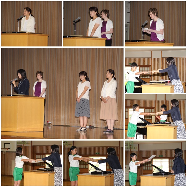 はじめに校長先生より,1学期でお別れとなる3名の先生方の紹介があり,お一人ずつお話を頂きました。お別れする事務の先生には3年という長い間,事務の仕事の他に給食や児童に配布する印刷など本当にお世話になりました。また英語の先生は,事情によりアメリカに帰ることとなりましたが,やさしく楽しい授業だったので本当に残念です。それから短い間でしたが,中高学年のほとんどの学級に入っていただき理科などの分科を受け持っていただいた先生には,合奏部でもお世話になり,本当にありがたかったです。3名の先生方の今後のご活躍をご期待申し上げます。
