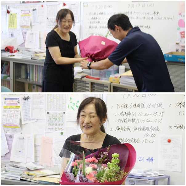 事務の仕事の他にも,給食のお仕事や先生方の印刷,学校に来た配布物の整理等々,陰ながらの仕事をたくさんやって頂きました。そして事務室の雰囲気をいつも明るくして,用事のある子どもたちを迎えていただきました。