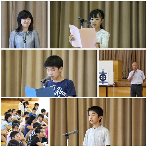 次に,表彰が行われました。七夕書道展での学校賞と奨励賞,市の水道ポスターコンクールでの最優秀賞,吹奏楽コンクールでの金賞,よい歯のダイヤモンド賞など,子どもたちのがんばりが光っていました。