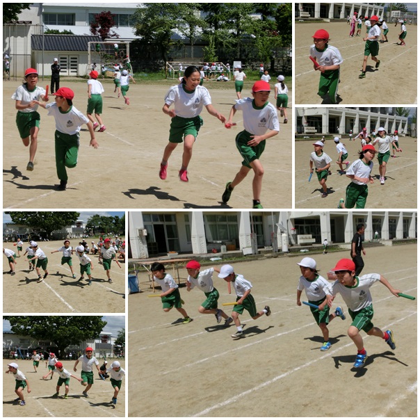 はじめにバトンパスを行い,その後で実際にバトンを回して校庭を走りました。4年生以上はみんな1周走ります。補欠の人も一緒に走りましたが,6年生は2周走った人もいました。