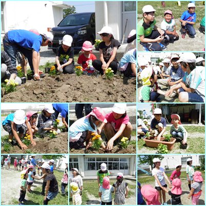 2人または3人組になり,幼稚園の花壇とプランターで,5年生が土を耕し,園児が苗を植える作業に仲良く取り組みました。