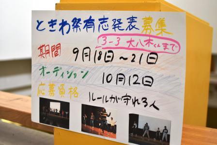 2018年9月10日 19時35分9月10日(月)ときわ祭に向けての準備が進んでいます。校内には有志発表の募集広告が貼られていました。募集期間は、9月18日(火)~21日(金)オーディションは10月12日(金)となっています。もちろんエントリーは喜多方二中生に限ります。どんな発表があるか楽しみです。