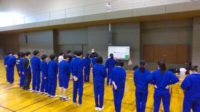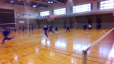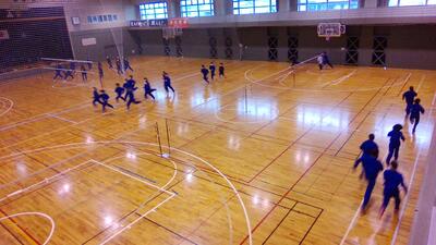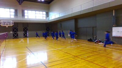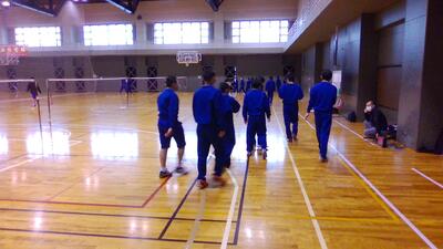 2022年3月31日 10時19分体育館でバドミントン部がインターバル走をしていました。つらい練習ですが、必ず結果につながります。頑張りましょう!写真を撮りに行くと、しっかり部長があいさつをしてくれました。素晴らしい!