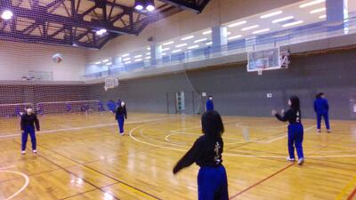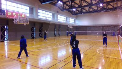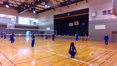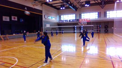 2022年3月31日 10時22分体育館でバレー部がウォーミングアップをしていました。レシーブやトス以外にも体づくりの練習メニューもあり、生徒たちは意欲的に取り組んでいました。