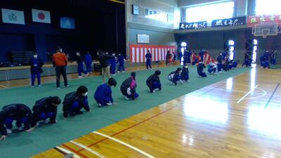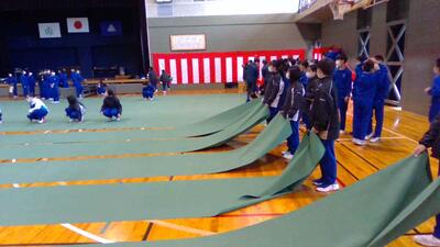 2022年4月5日 10時20分体育館では、入学式準備が行われました。各部活動で仕事を分担して準備をしました。写真は、協力してシートをしいたり、紅白幕をはったりしている様子です。