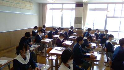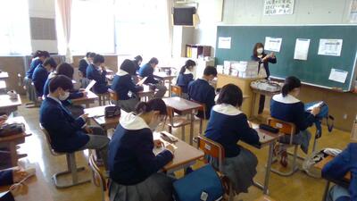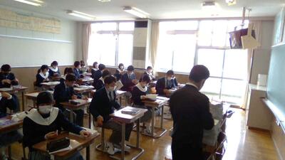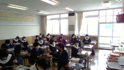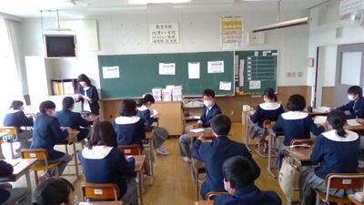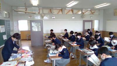 2022年4月6日 09時41分始業式後の3年生の学級の様子です。新しい仲間との出会いを大切に、中学校生活最後の1年を過ごしてほしいと思います。写真は、3年生で使う教科書を配付している様子です。しっかり名前を書いて、授業で使いましょう。
